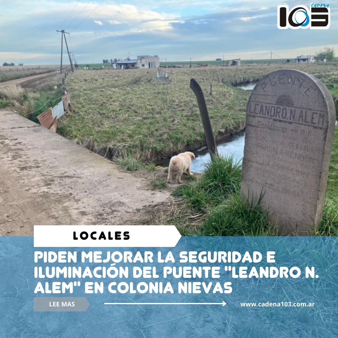 Este lunes, el Bloque PRO presentó un proyecto de Resolución para instalar barandas de protección e iluminación en el puente «Leandro N. Alem», ubicado sobre el Arroyo Nievas en Colonia Nievas. La iniciativa surge en respuesta a una solicitud presentada en septiembre por la Sociedad de Fomento local, que urge a realizar una evaluación técnica y colocar las medidas de seguridad necesarias lo antes posible.
