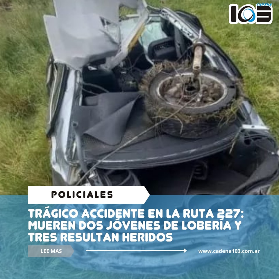 Dos jóvenes de Lobería, identificados como Valentín Valle y Agustín de Dios, fallecieron en un accidente ocurrido en la madrugada del viernes en la Ruta Provincial 227, cerca de Necochea. El auto en el que viajaban, un BMW, se despistó, cambió de carril y volcó en una banquina. Otras tres personas, dos mujeres y un hombre, que también iban en el vehículo, fueron trasladadas al Hospital Municipal de Lobería con heridas.