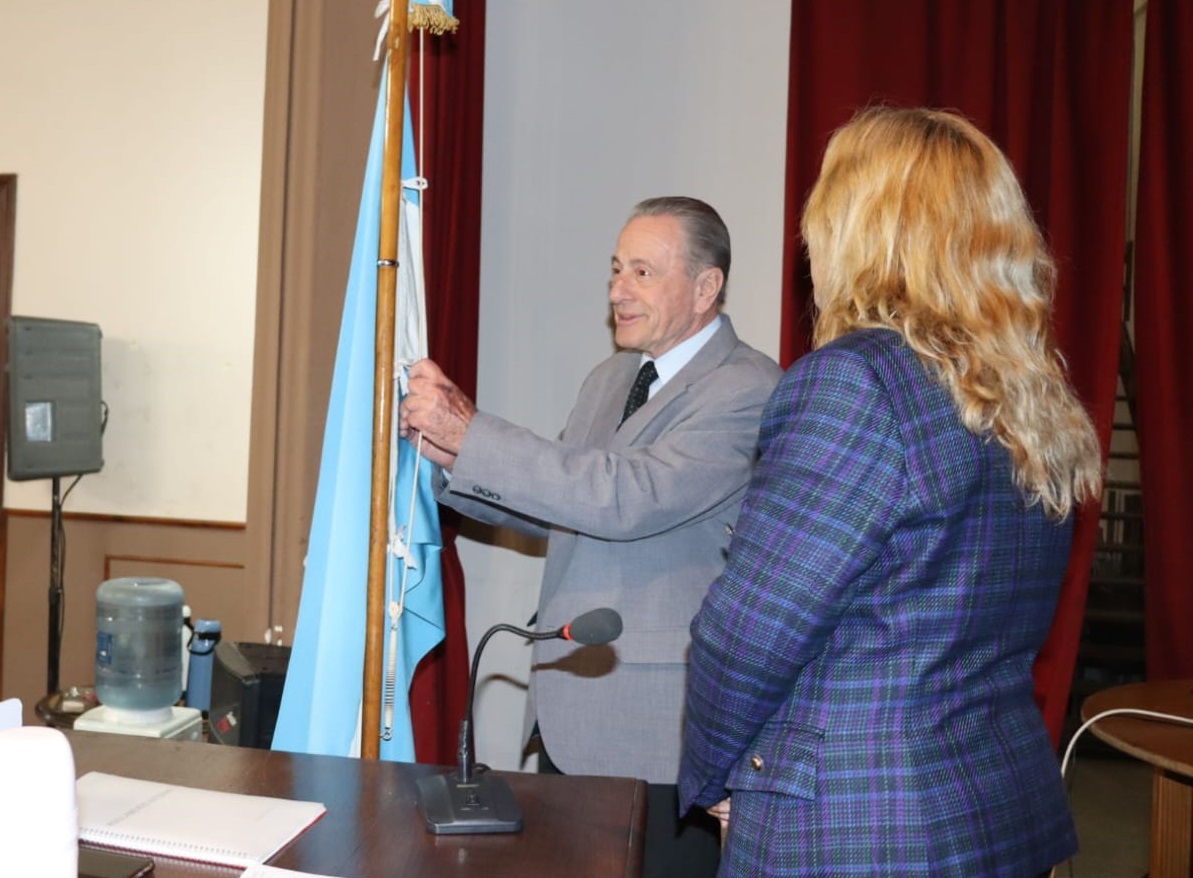 Hugo Galgano, concejal electo en 1983, fue convocado al estrado para izar la Bandera Nacional y dar inicio formal a la Sesión de la que participaron además ex concejales del Partido de Olavarría.