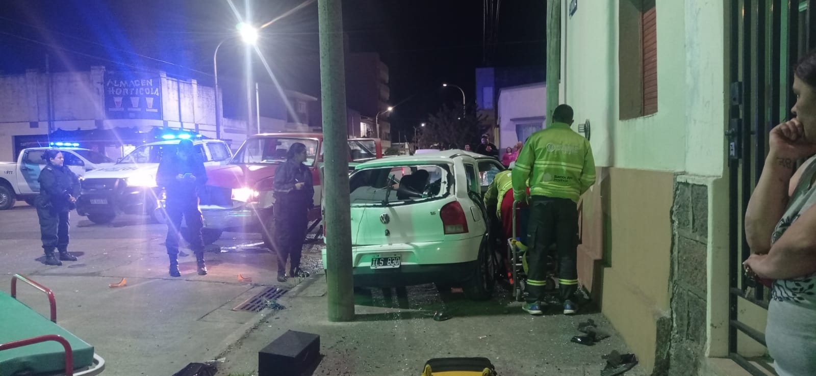 A raíz de la violencia del impacto los dos vehículos hicieron un trompo y el VW Gol terminó sobre la vereda chocando contra una vivienda y una columna.